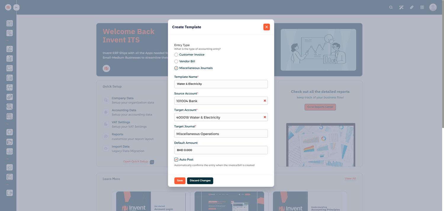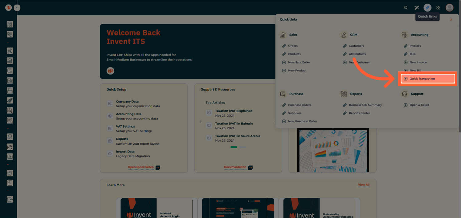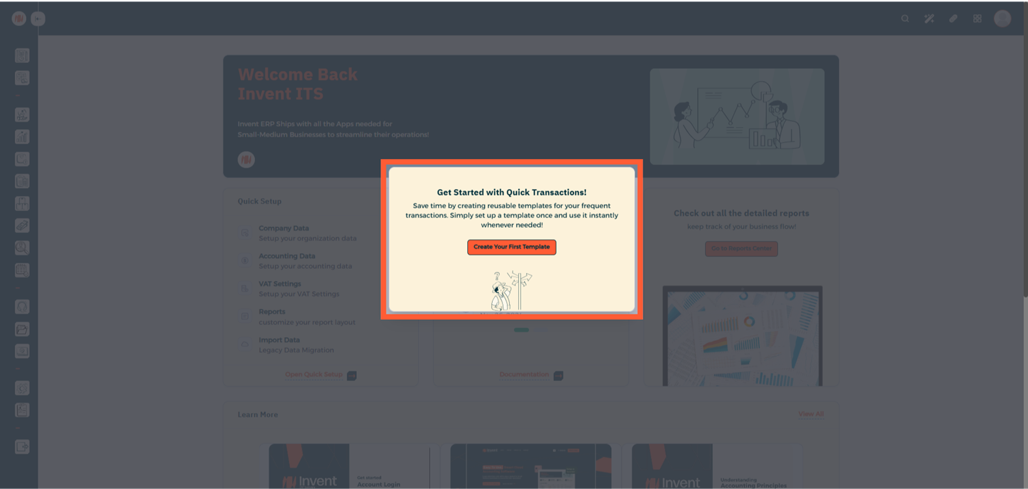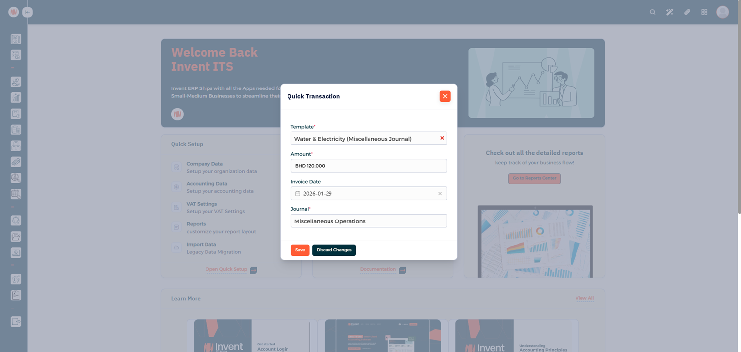 Quick Transactions in Invent ERP are designed to save time and simplify accounting entries for recurring for frequently used transactions. By creating reusable templates. you can post transactions instantly with minimal input keeping your financial reports accurate and up to date.
