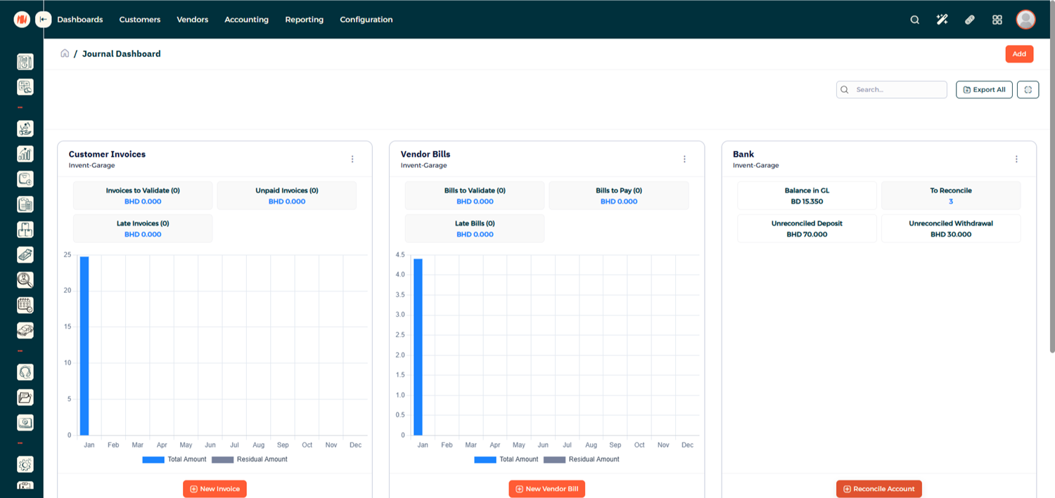 Once inside Accounting, you'll be directed to the Journal Dashboard, where you can view your bank accounts and journal details.