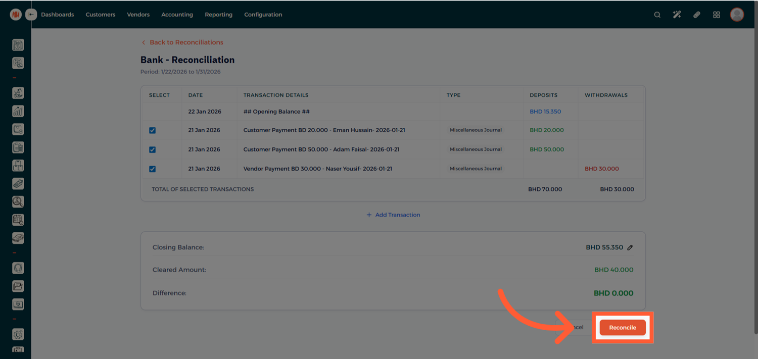 Once all transactions are reviewed and the balance matches, click Reconcile.