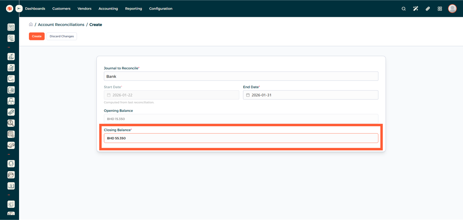 Enter the Closing Balance based on your bank statement for the selected reconciliation period, and click Create.