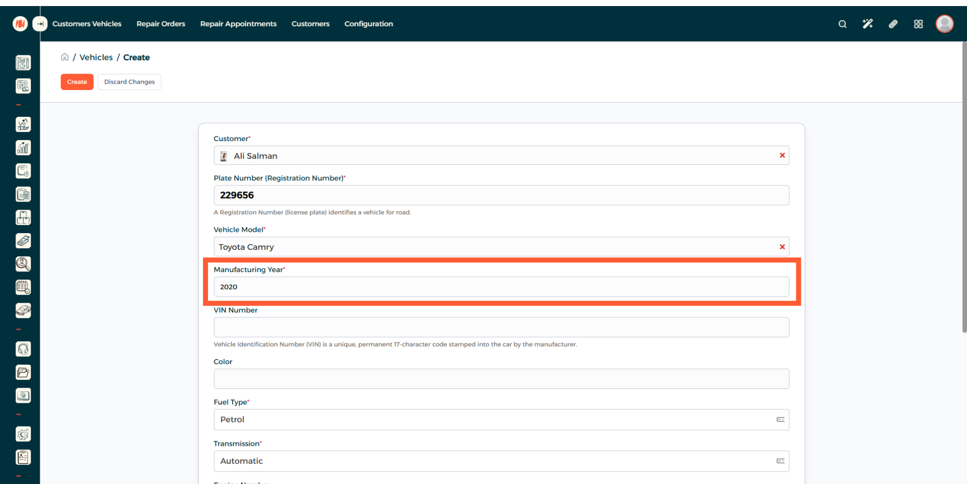 Step 6: Enter Manufacturing Year