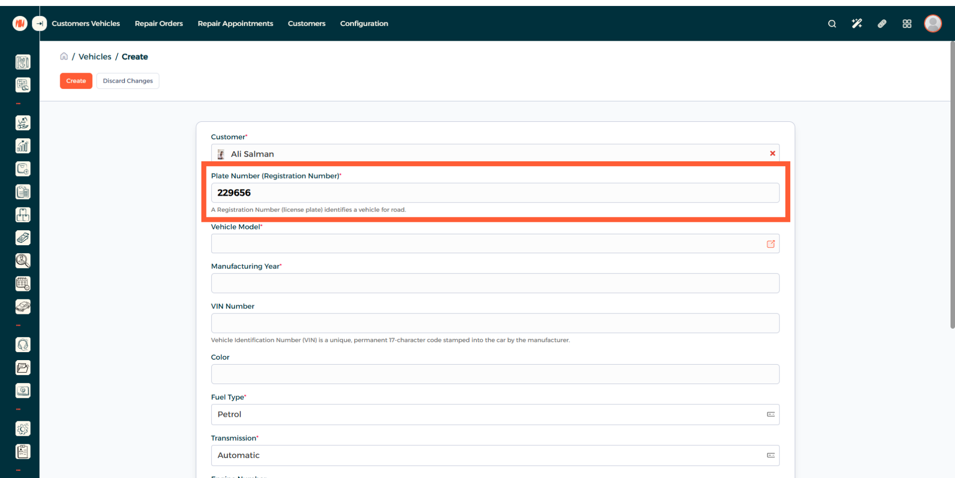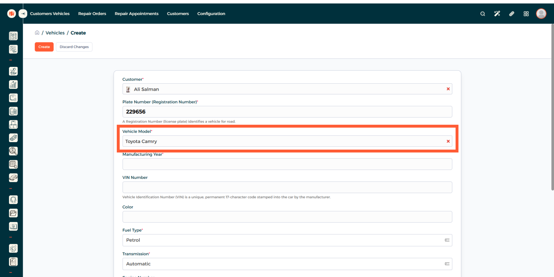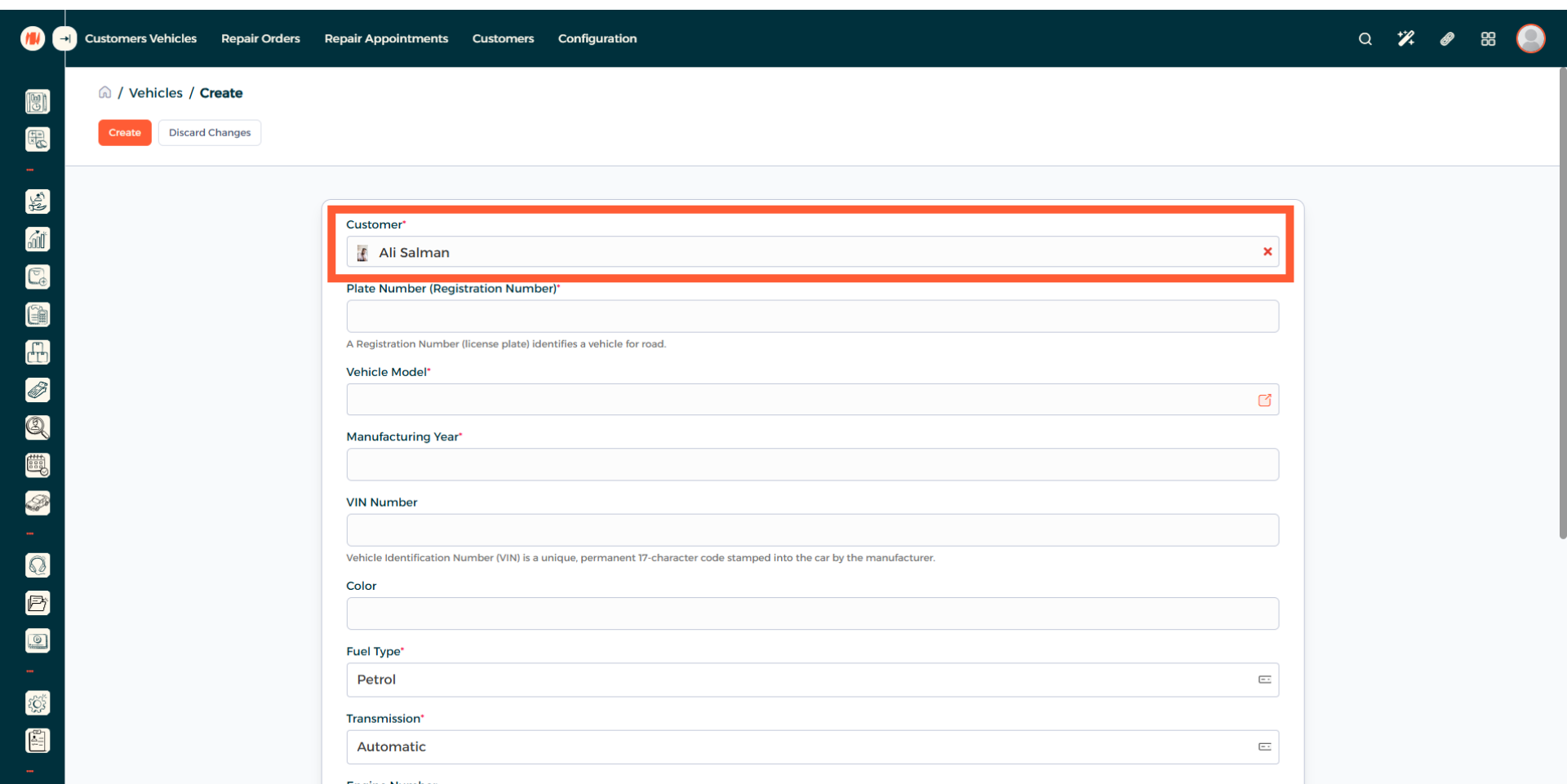 Now you can see the vehicle creation page. Begin by adding a customer.
