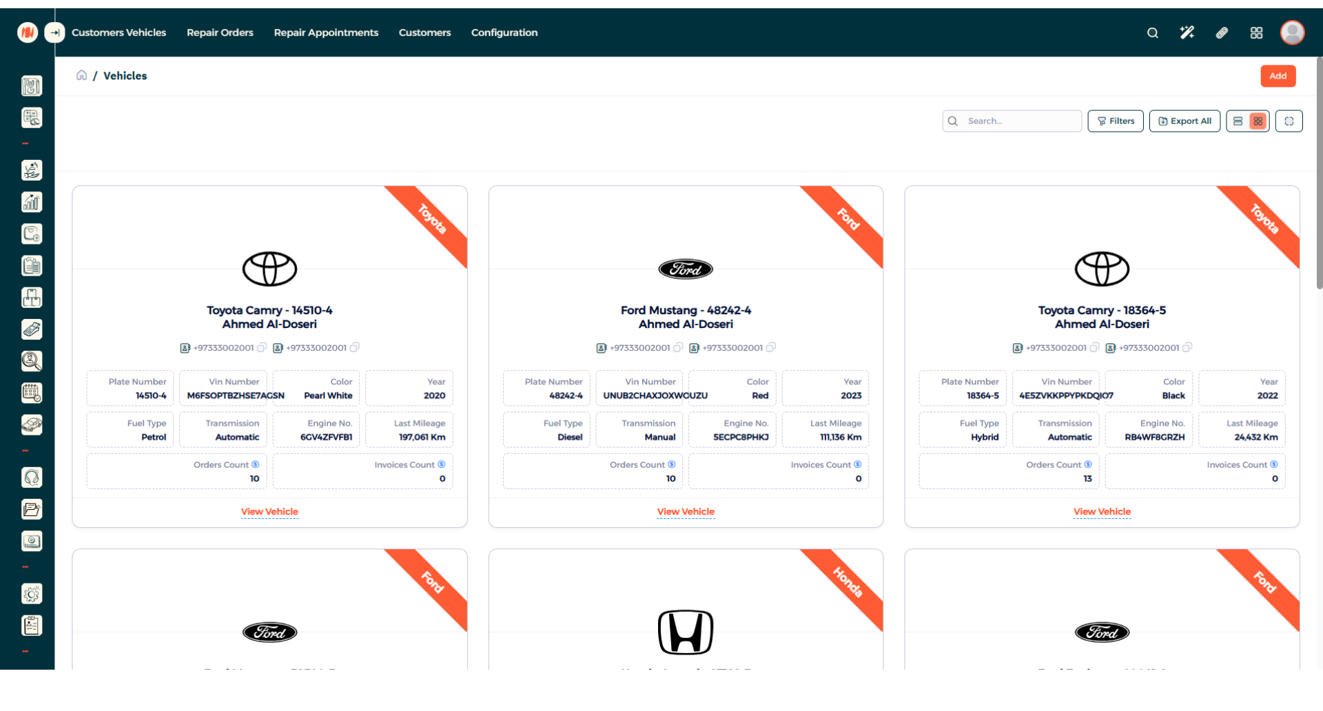 A: In the vehicle's page, you can search by plate number, customer's mobile number, customer's name, VIN number, or just use the filter option available.