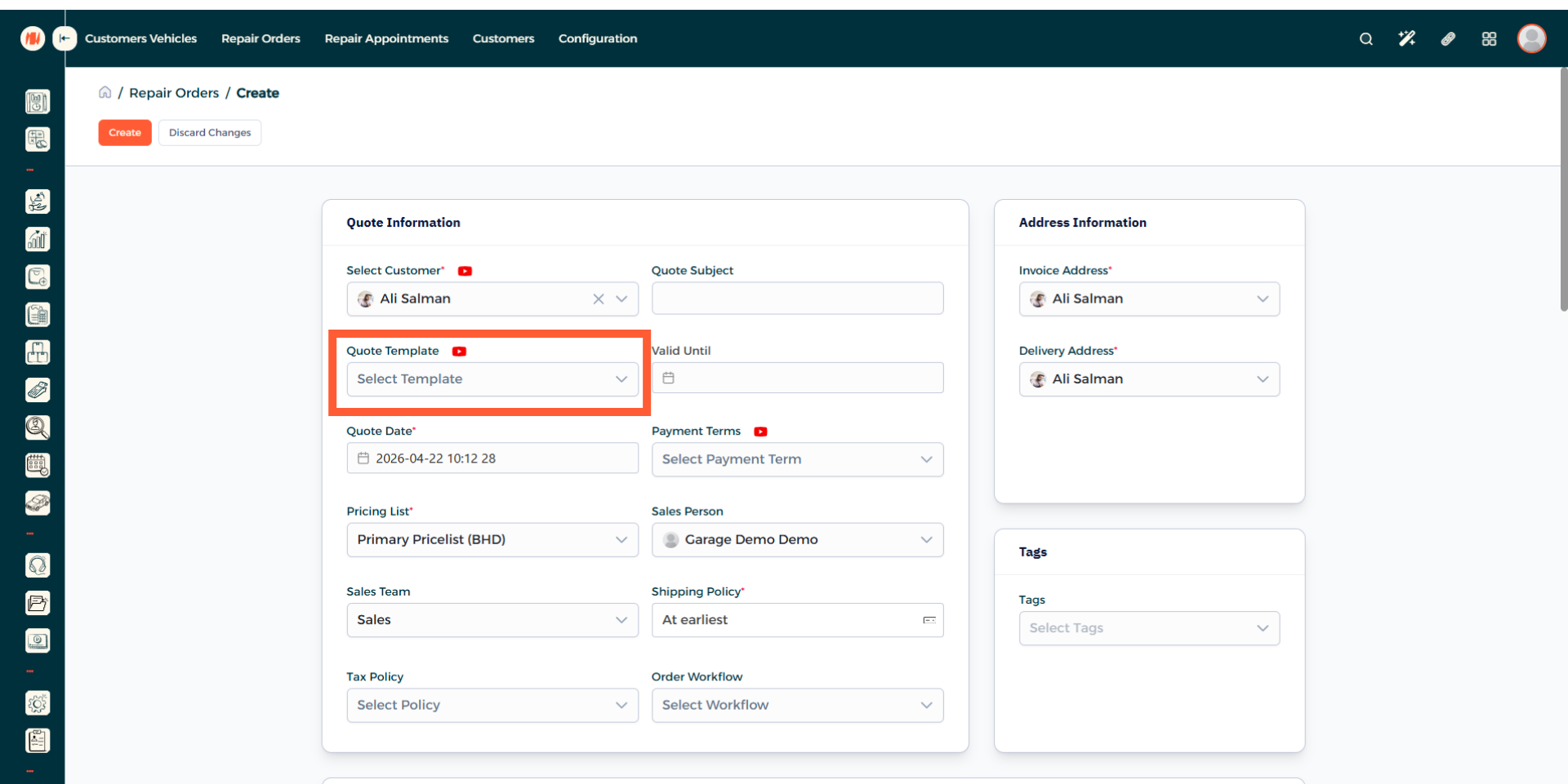 Add a quote template, this speeds up quoting and avoids re-entering details every time. If you do not have one you can create one.