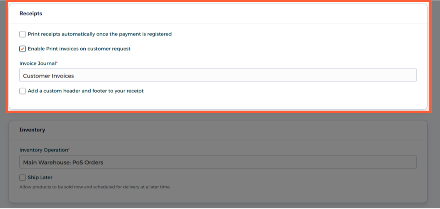 • Enable Print invoices on customer request: Choose whether creating an invoice is mandatory or not.