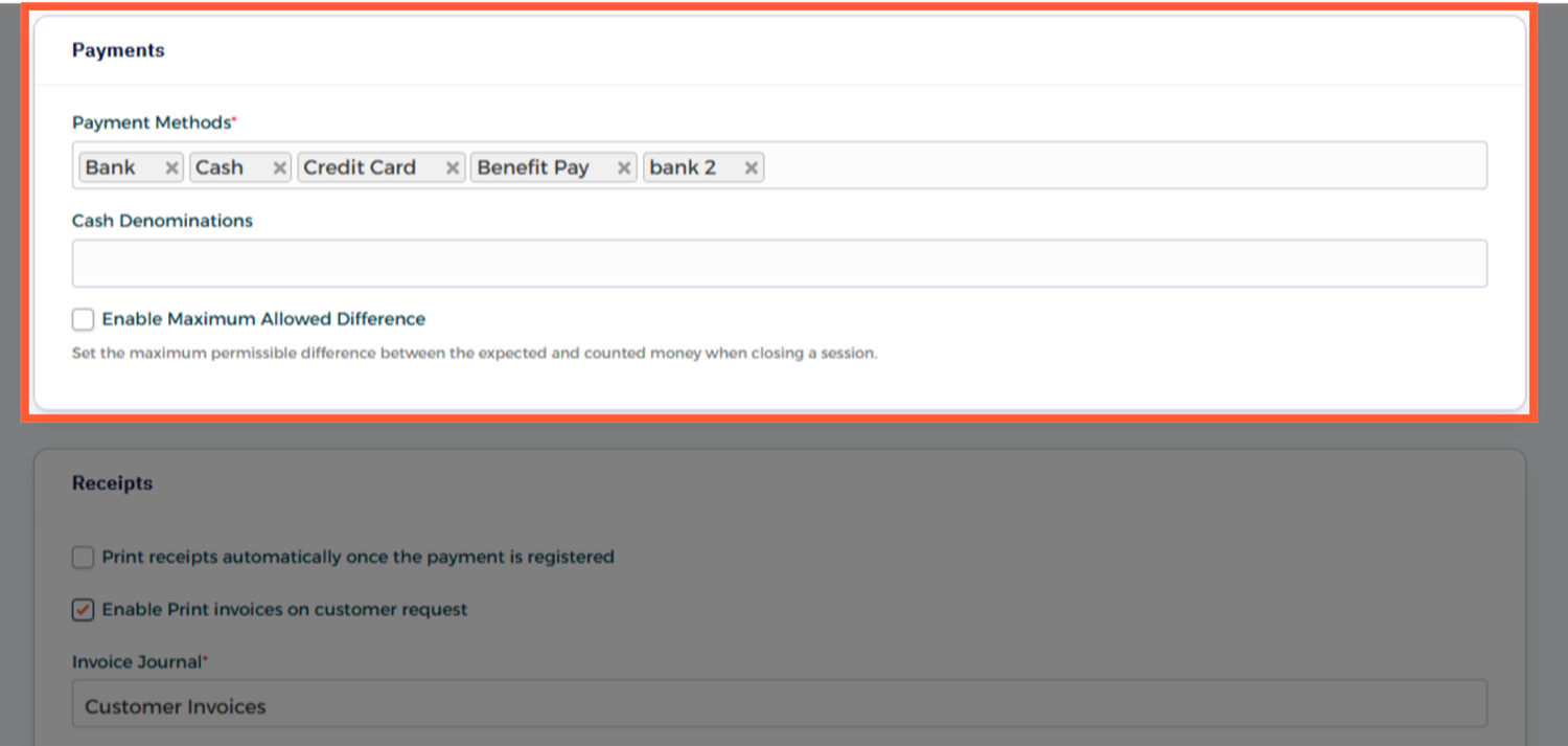 • Payments Methods: Select the payment methods you want to assign to this POS for processing transactions.