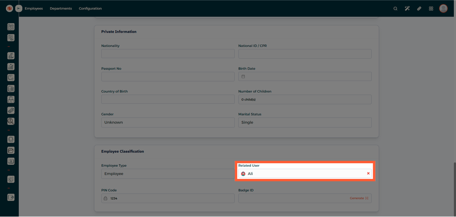 At the bottom of the page, Link the Employee to the User Account you created earlier